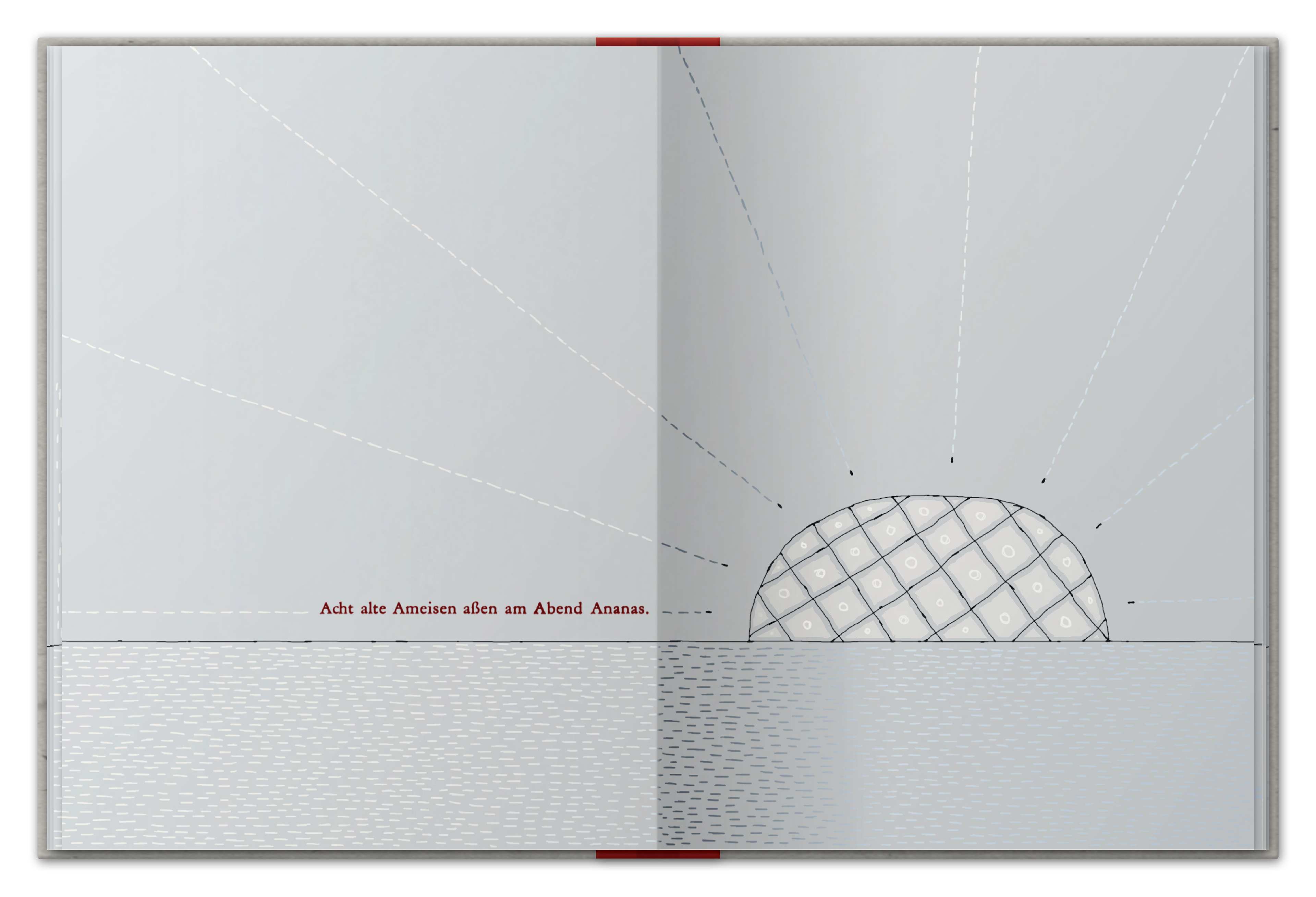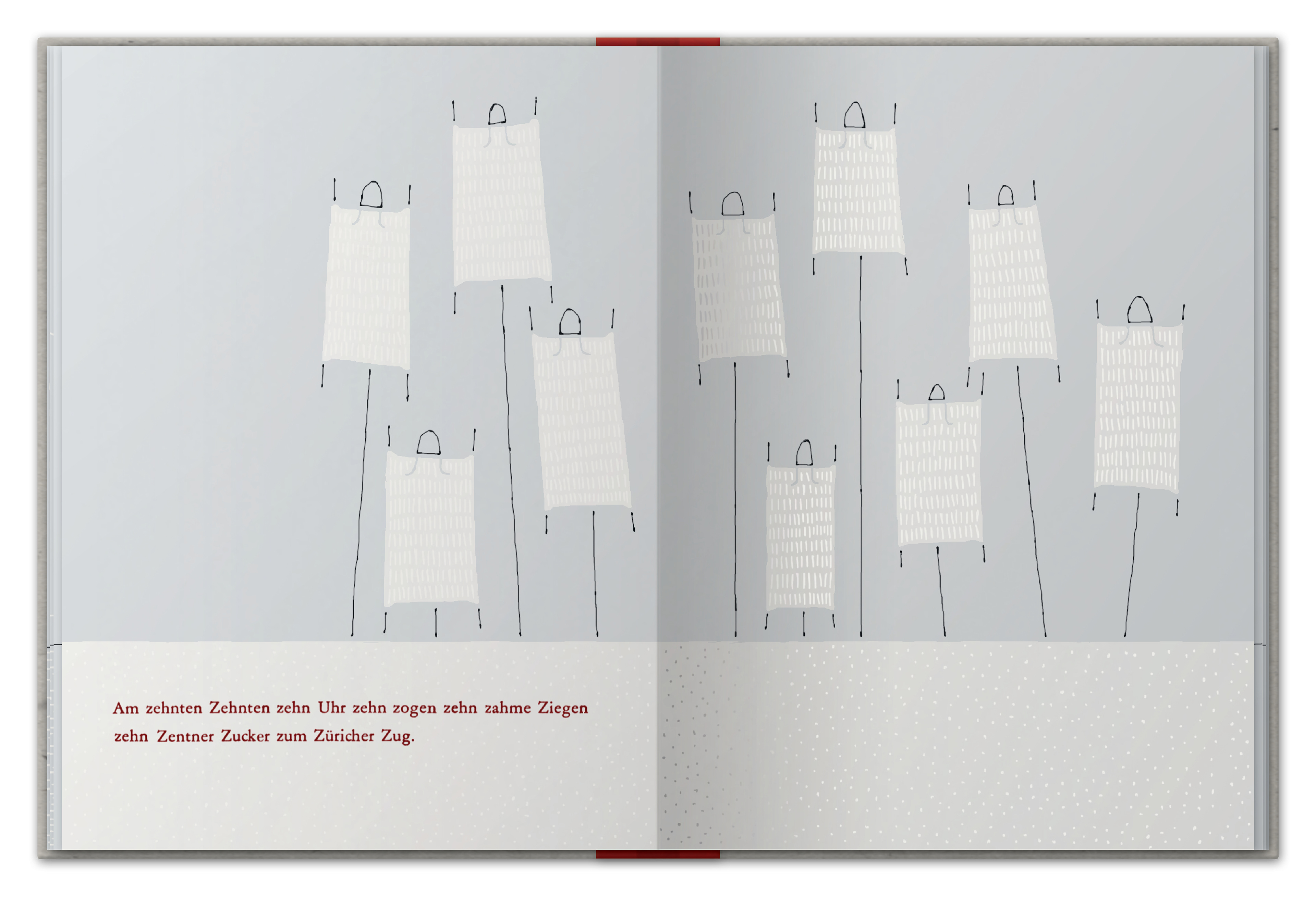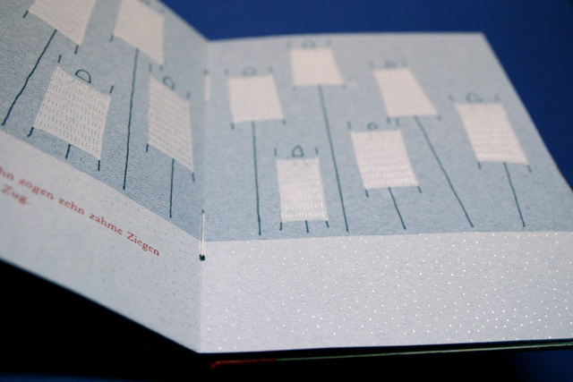 Illustrated book of German tongue twisters. The book has been printed once in about 30 copies. Text is handset and printed in letterpress, illustrations are printed with two layers of white and one layer of silver on coloured paper. Made together with the publishing house mückenschwein, Stralsund. Silk screen: Percy Penzel / Book binding: Fred Lautsch