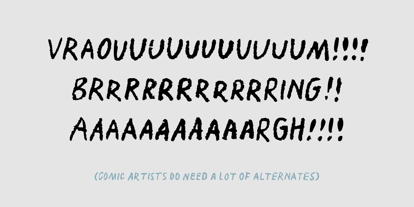 Comic artist Paula Bulling asked me make a font from her handwriting. We worked together to make the font authentic and legible. When drawing with a pencil, the stroke gets wider on every letter. So in order to achieve this we made 11 versions of every letter, and some OpenType programming chooses the right one for the right place.